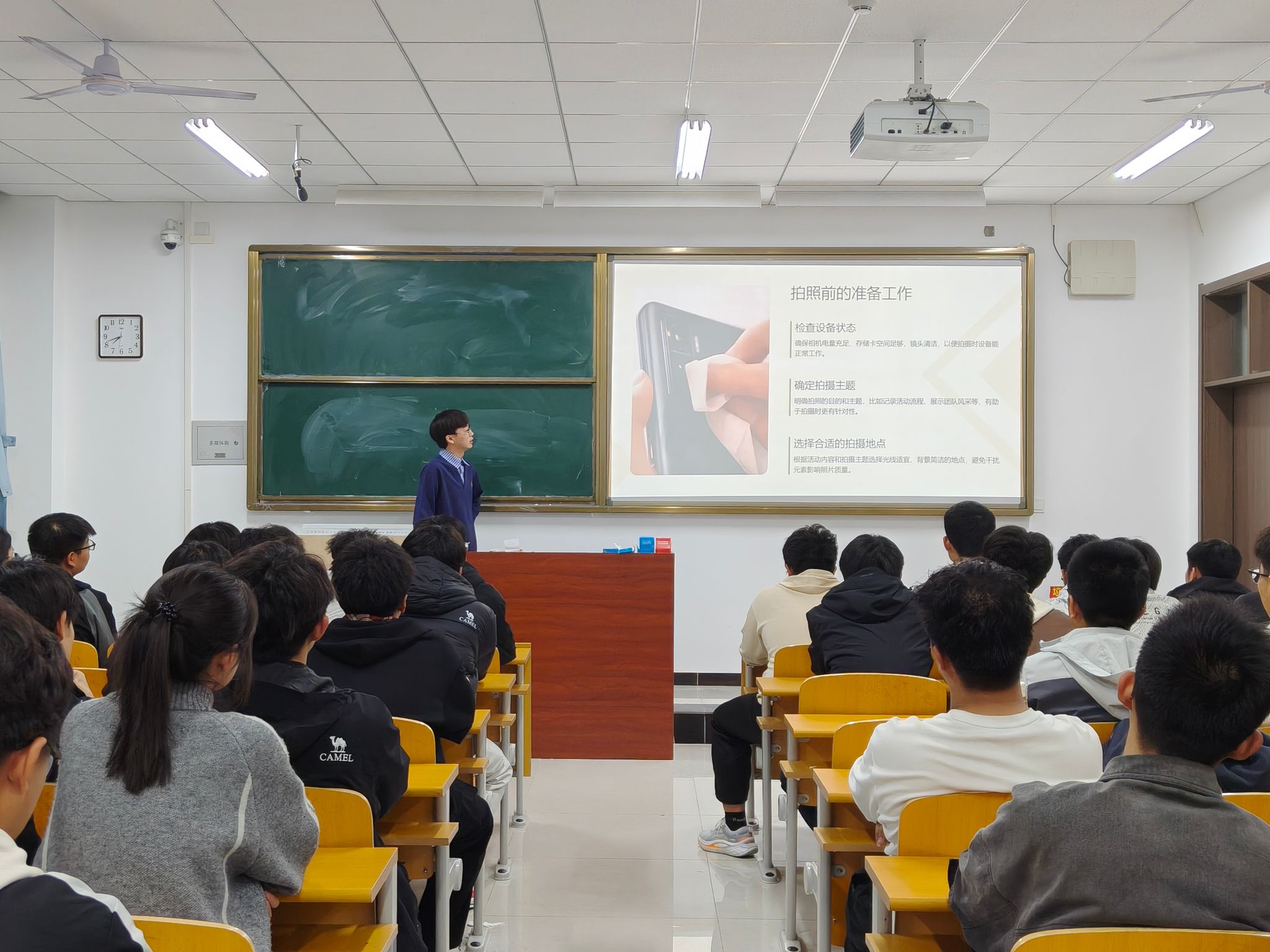 培训以“问题指出—错误案例—拍照要求—方法技巧”为主线展开。刘佳昌首先列举出同学们在拍摄时的高频错误。随后,他结合四张“反面案例”照片,逐一剖析拍摄效果不好的根源。紧接着,他为同学们展示了规范示例照片,让同学们有了更直观、深刻的认识。最后刘佳昌结合自身经验,教授同学们拍照方法技巧,并告诉同学们要勇于拍摄,多次实践提升自己的拍摄水平,使同学们收获颇丰。