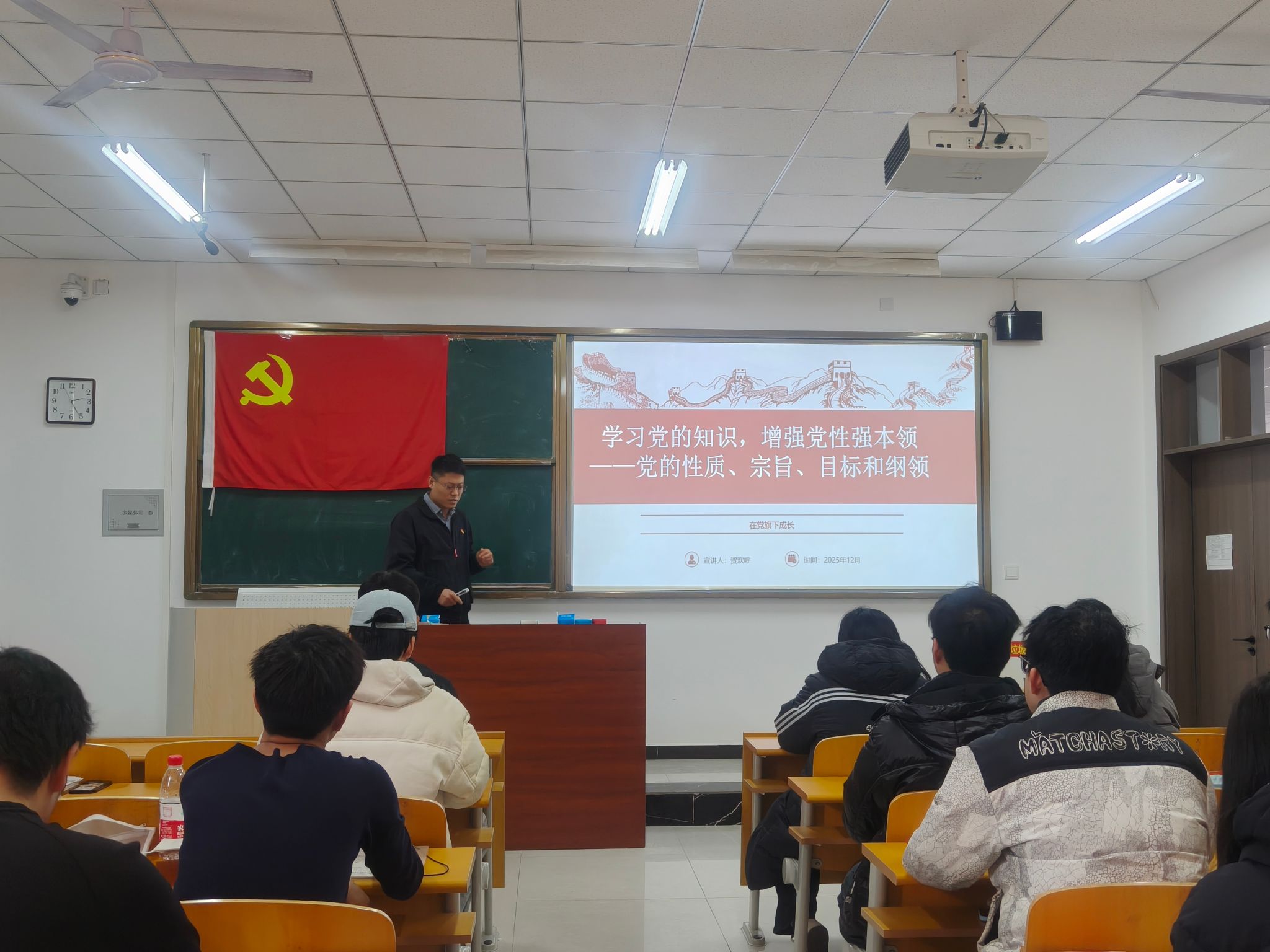 培训伊始,贺欢呼老师首先阐述了党的性质。他指出,中国共产党是中国工人阶级的先锋队,同时是中国人民和中华民族的先锋队。这“两个先锋队”的定位,决定了党始终代表最广大人民的根本利益。贺老师结合党史脉络,从嘉兴南湖的红船精神讲起,生动讲述了党在百年征程中如何带领中国人民实现从站起来、富起来到强起来的伟大飞跃,深刻剖析了党作为“领导核心”在国家发展中的关键作用。