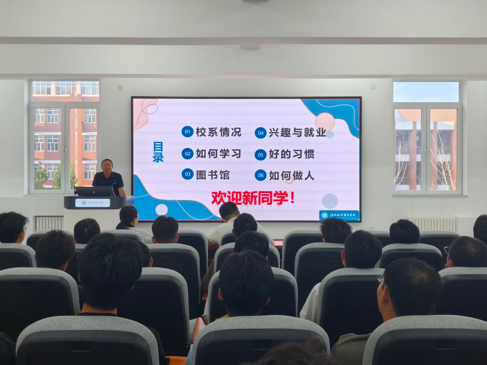 随后,机械工程系主任张铁壁以“我的大学生活”为题,详细介绍了学校以及机械工程系的办学历程,发展沿革;随后介绍了机械工程的师资队伍、实践教学条件、学生近三年的就业与考研数据,以及专业社团等情况。强调机械工程系会为同学们提供了良好的学习与实践环境,鼓励同学们树立远大的目标,积极参与各类实践活动,在未来的学习中能够勇于探索,敢于创新。同时张主任鼓励大家要养成良好的习惯,在学习、生活、健身、作息等方面要有计划,重落实,常完善,他表示良好习惯成就美好未来。最后张主任希望同学们诚实守信,脚踏实地,成为一个志气、有骨气、有底气的向上青年,也衷心祝愿大家在未来的四年学有所获,心想事成!