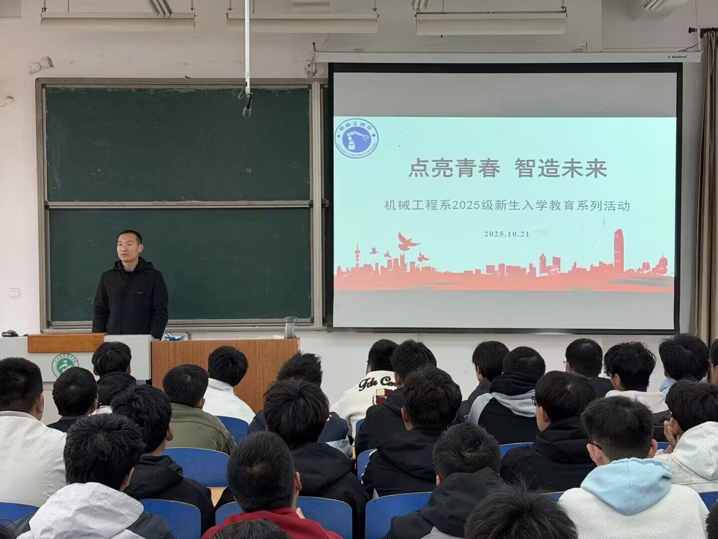 为帮助2025级本科新生适应大学学习生活、完成角色转换,10月21日上午在4C201开展入学教育系列活动之一讲座。机械工程系党委副书记杨学智为全体2025级本科新生作题为“点亮青春,智造未来”的专题讲座。